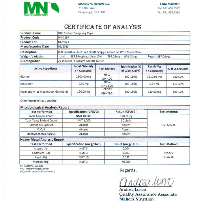 Magnesium is an essential mineral that supports relaxation and healthy sleep. Dr Brad included 126 mg of elemental magnesium in the glycinate form. Magnesium glycinate is magnesium bound to the amino acid glycine, making it highly absorbable and easy on the stomach (it avoids the laxative effect some other forms can cause).
