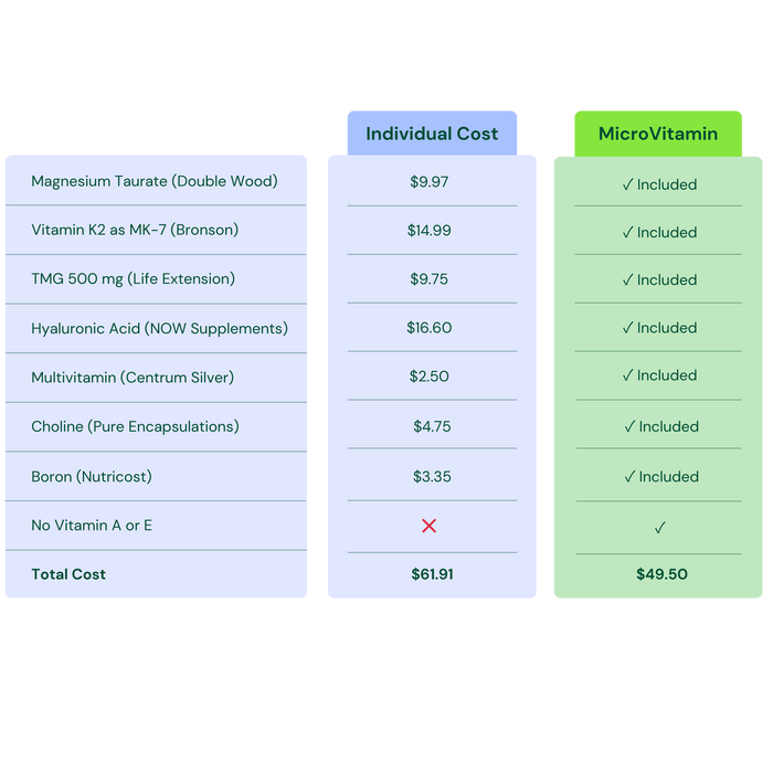 Not only does MicroVitamin save you $12.41 per month, but it also eliminates the hassle of managing multiple supplements, ensuring you receive the right balance of nutrients to support your health without the extra cost.